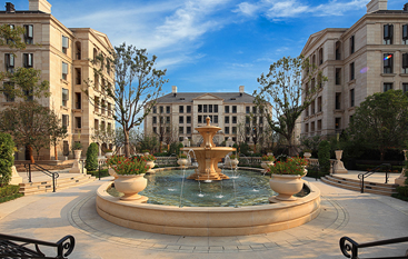 法式多层公寓系列的规划采用法国古典主义建筑的布局方式,注重轴线关系、空间序列感和延续性。要求规划结构明确,强调空间的均衡和稳定,空间层次清晰,脉络完整。庭院设计强调私密性,创造围合空间。